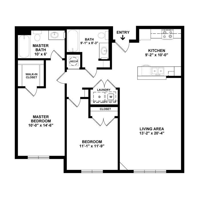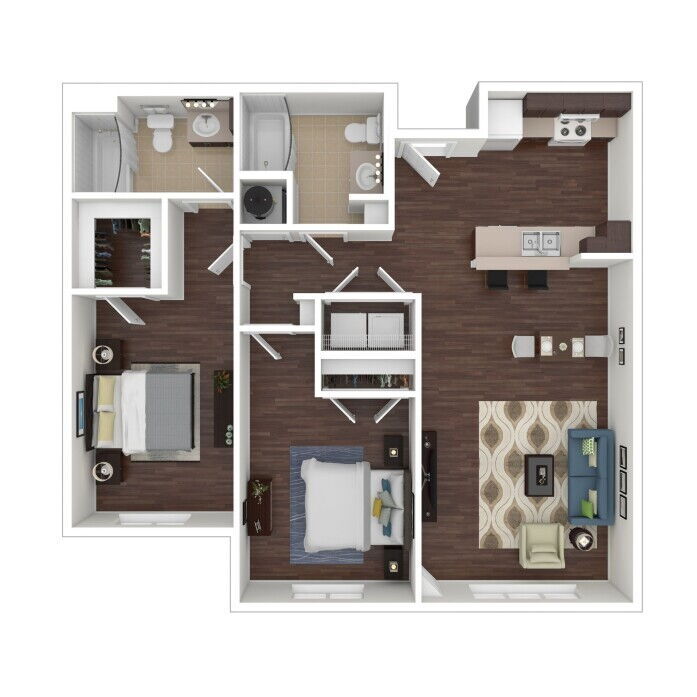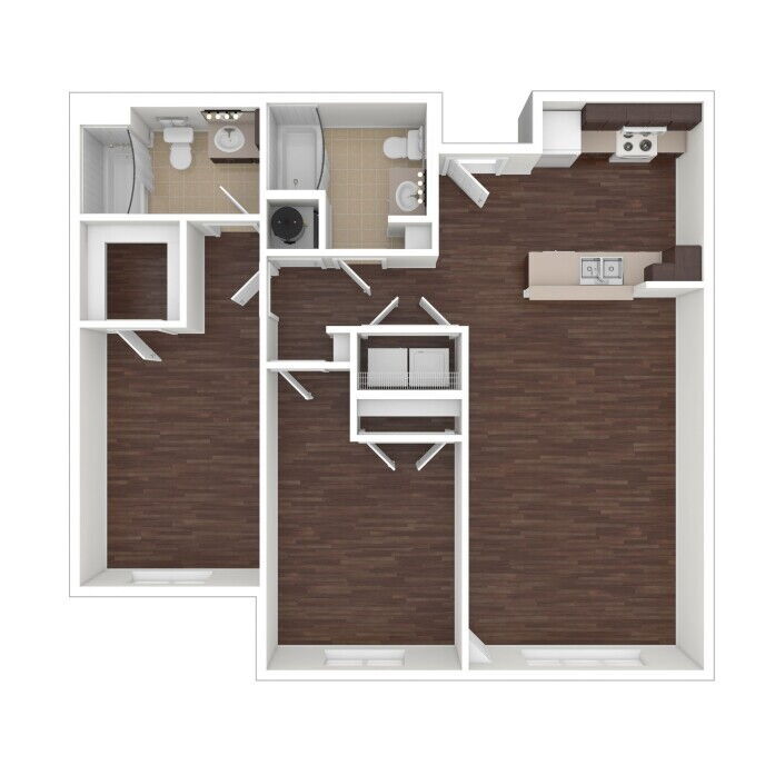 Our two-bedroom Bayview floor plan features a master suite and a private patio.